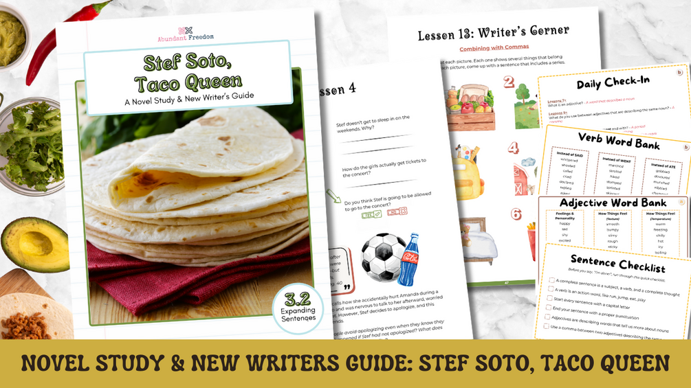 Build confident readers and writers with this step-by-step novel study and beginning writer's guide based on the book Stef Soto, Taco Queen by Jennifer Torres. Designed for 3rd graders (or learners that need an introduction to formal writing instruction), this unit guides learners through the story while teaching essential writing skills in a clear, manageable way.